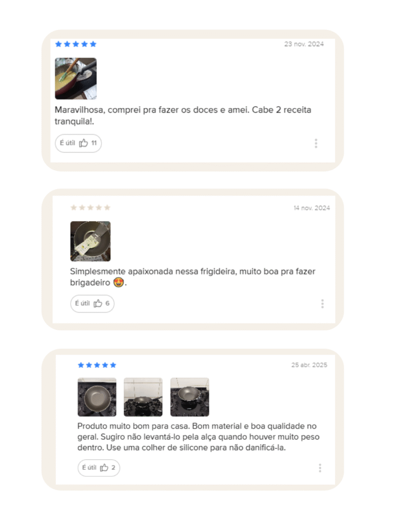Nada melhor do que ouvir quem já tá usando essas panelas na batalha diária da cozinha. Espia só os comentários de quem comprou: